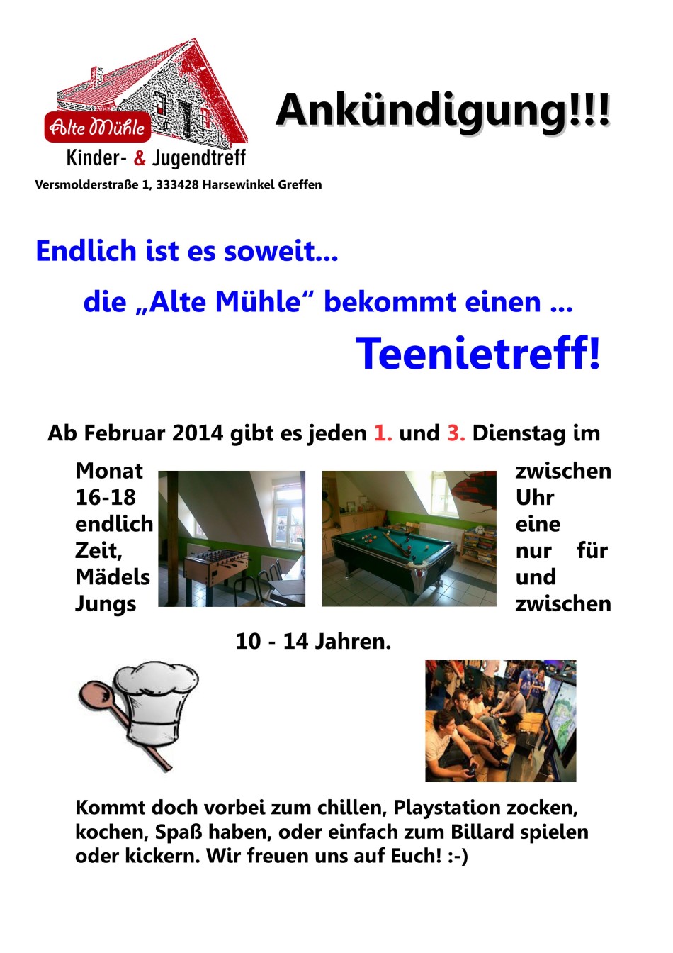 Hallo liebe Besucherinnen und Besucher der „Alten Mühle“, nachdem sich Einige von Euch eine eigene Zeit im Treff gewünscht haben, können wir nun endlich ankündigen….ab Februar haben wir nun endlich jeden 1. und 3. Dienstag im Monat von 16-18 Uhr nur für Mädels und Jungs im Alter von 10-14 Jahren geöffnet. Hier der aktuelle Flyer…