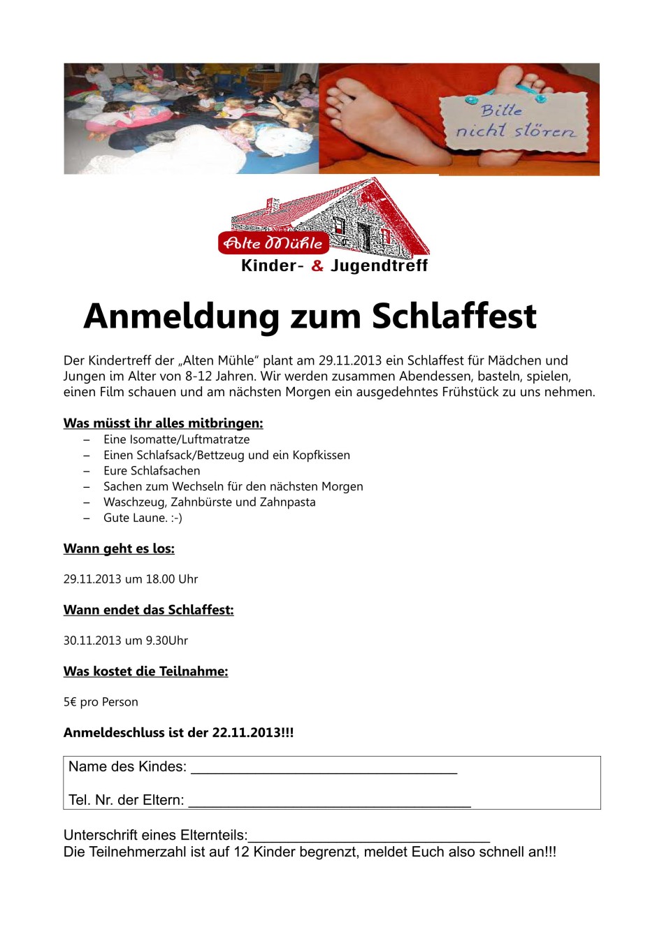 Liebe Besucherinnen und Besucher des Kinder- und Jugendtreffs, liebe Eltern, am 29.11.2013 ist es wieder soweit, wir bieten unser zweites Schlaffest für Kinder zwischen 8-12 Jahren an. An diesem Abend werden wir zusammen zu Abend essen, basteln, Spiele spielen, bei gutem Wetter eine Wanderung im Dunkeln unternehmen und einen spannenden Film anschauen. Am nächsten Morgen wird es ein großes Frühstück geben. Das Team der „Alten Mühle“ freut sich über viele Anmeldungen. Alle weiteren Informationen stehen auf dem Anmeldungsflyer!